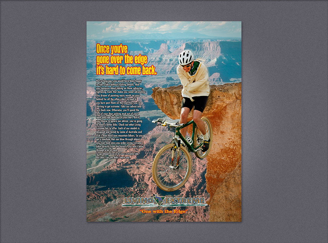 Living Extreme magazine ads Living Extreme Over the Edge magazine ad Living Extreme Skydiver magazine ad Living Extreme [ mountain bike manufacturer ] full page magazine ads . < | design | advertising design | >